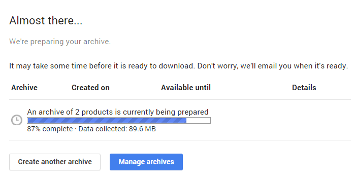 Google will make an archive file, using the settings you have provided. They show a progress monitor, and this can take some time. When the process is finished, they send your and email, and show a link to your archive file on the screen.